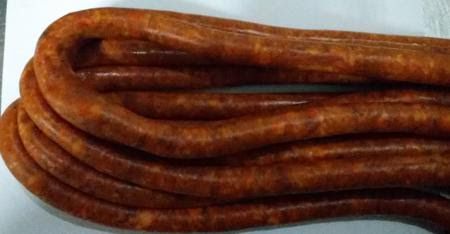 Todo ello, se descarnaba a mano sacando la lengua, e incluso, los ojos sin la pupila, y sin echar la careta o forro porque esto hacía que se pusiese muy dura en poco tiempo y era mejor dejarla para hacer blanco o butifarra o parrillada. Con todos estos ingredientes, ya en frío, se picaba y se amasaba (todo a mano, era lo que había), se añadía la sal, el mejor pimentón dulce murciano (nunca pimentón ahumado), hasta aquí es como la chistorra.
